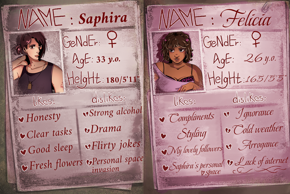 If a romance element is planned( no matter how "small" it is) i hope you concider Saphira (and maybe also Stefan) ,since i dont really see something between her and Felicia happening (ive read some comments saying that they think it will but in my opinion they dont really fit since Felicia doesnt respect her personal space at all and in generell fits almost completly in Saphiras "Dislike category"), as an option :)